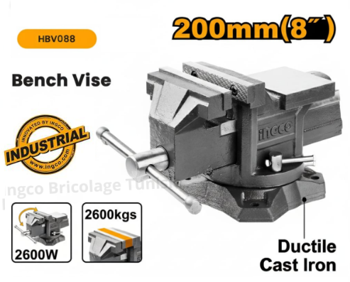Base pivotante Taille : 8″ Poids : 21 kg Force de serrage maximale : 2 500 kg Avec enclume Emballé dans une boîte en carton