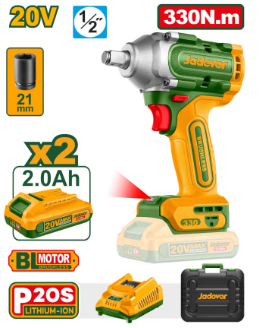 Moteur sans balais. Tension : 20 V. Carré d’entraînement : 1/2″. Vitesse à vide : 0-1600/0-1900/0-2300 tr/min. Fréquence de frappe : 0-2100/0-2500/0-2900 coups/min. Couple de serrage : 330 Nm. Couple de desserrage : 430 Nm. Éclairage de travail LED intégré. Contenu : 1 douille de 21 mm, 2 batteries 2,0 Ah (JDLBP520), 1 chargeur (JDFCP518). Tension de charge : 220-240 V~50/60 Hz. Livré avec une mallette de transport
